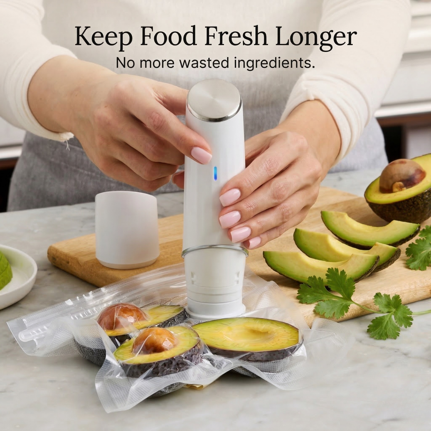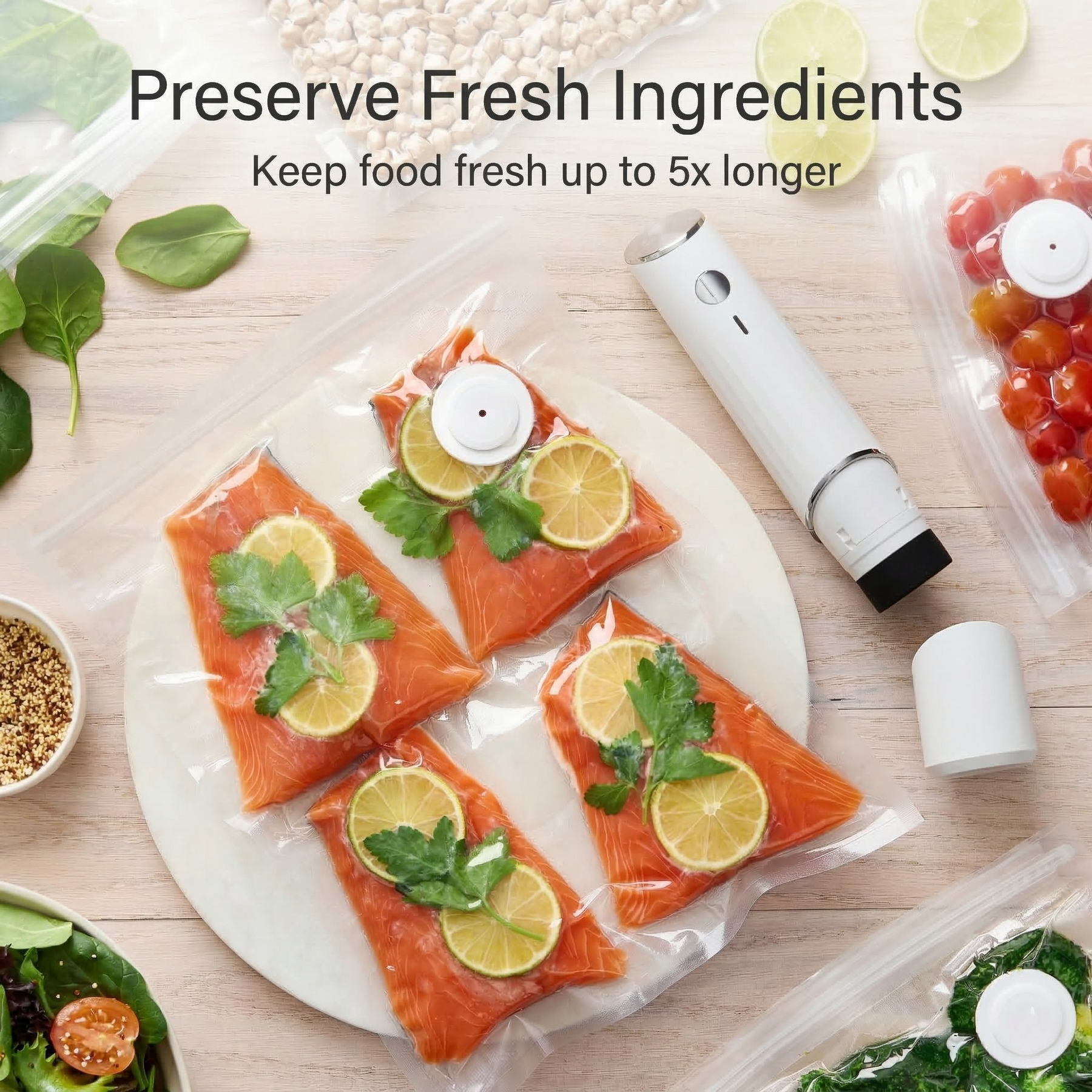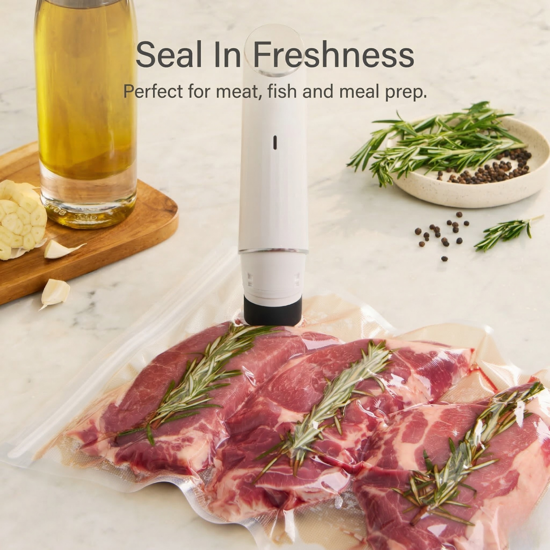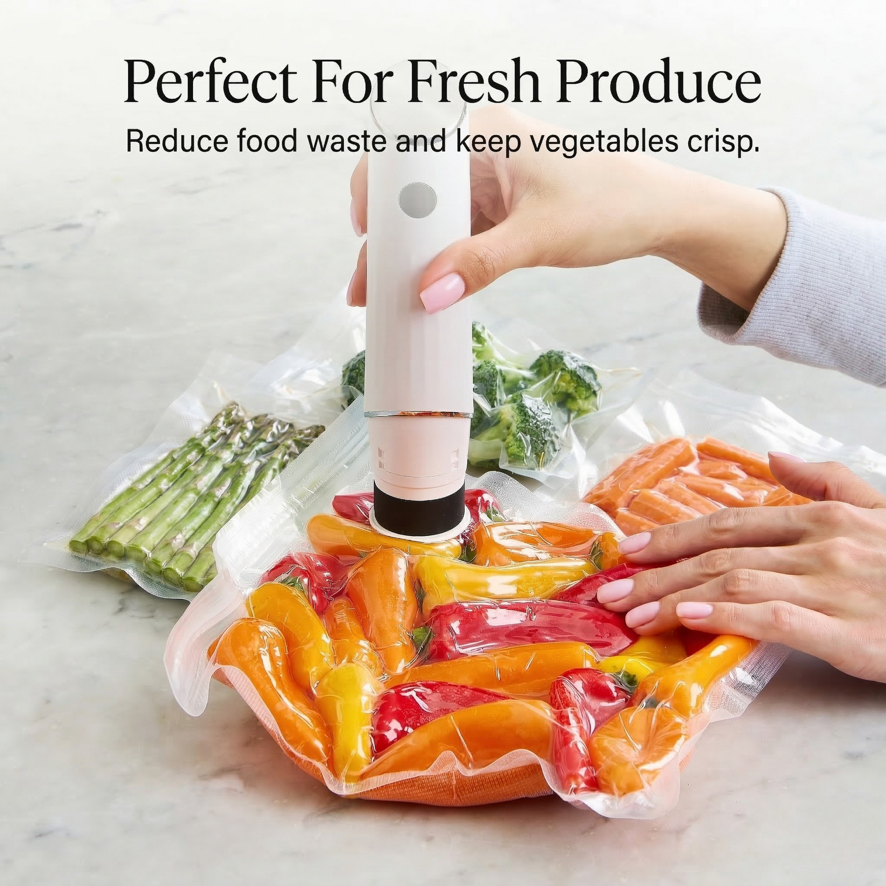With a simple press of a button, the device removes air from compatible storage bags to create a tighter seal. This helps slow down oxidation and extend the freshness of your ingredients.