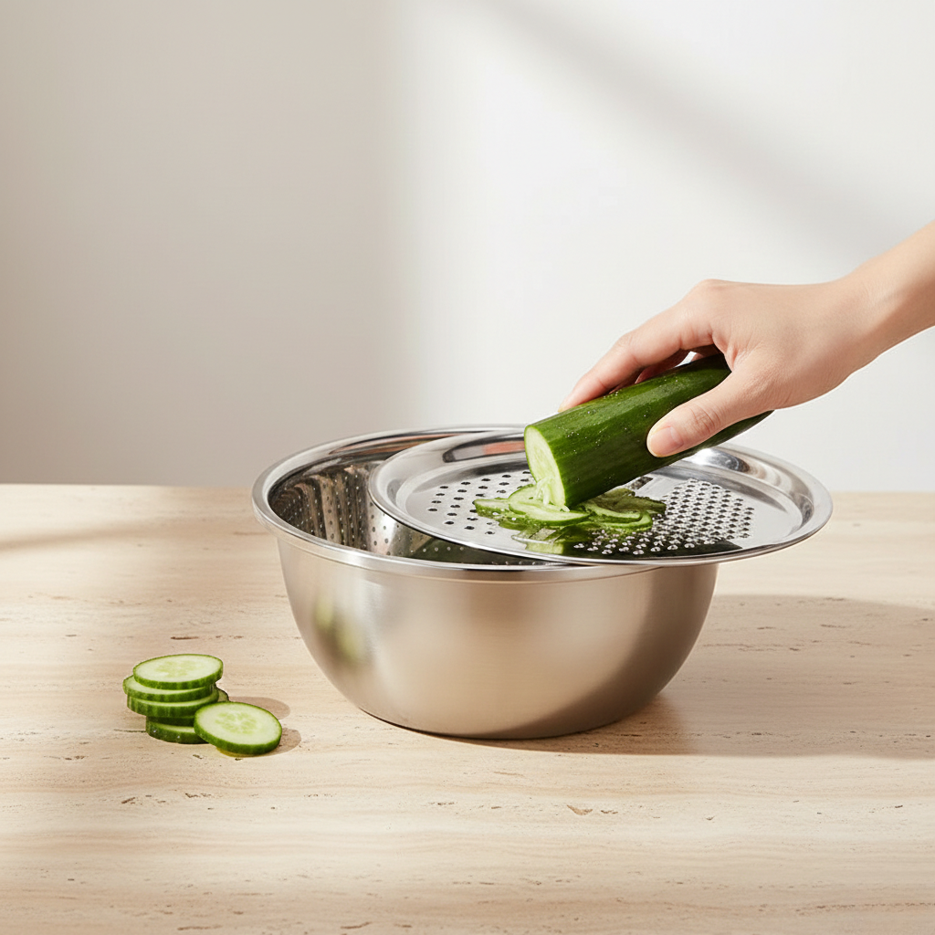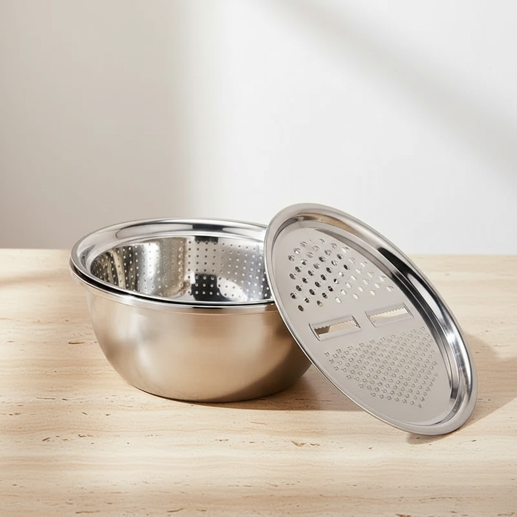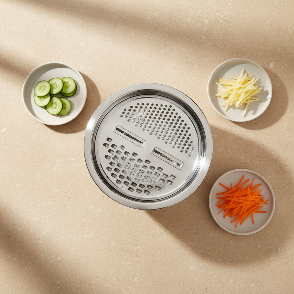 Use the colander to rinse vegetables and fruit, the bowl to collect drained water, and the grater attachment to shred or slice directly into the bowl. Designed to simplify prep without excess tools.