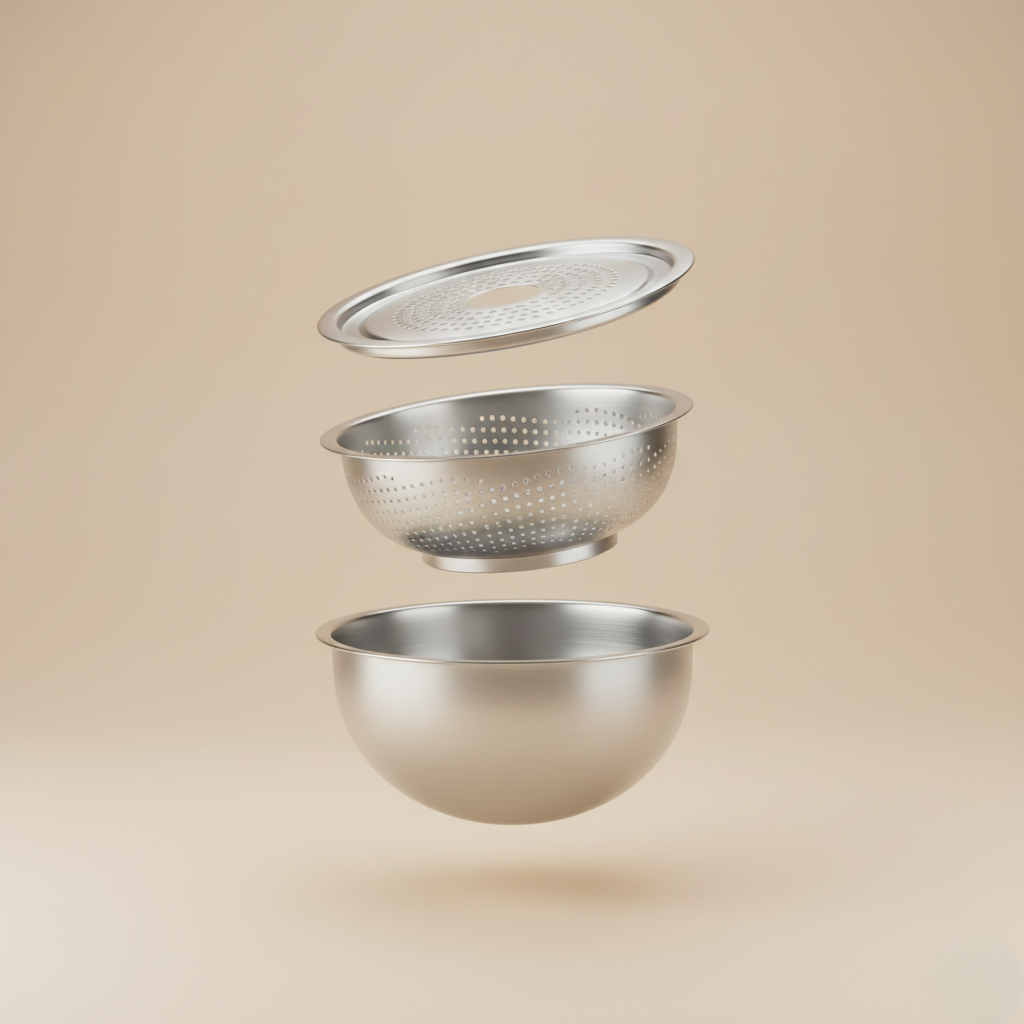 The nested design allows all components to stack neatly, helping maintain organised cupboards — ideal for smaller kitchens.